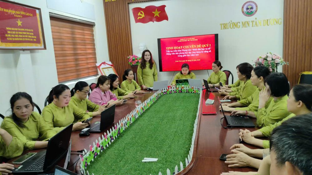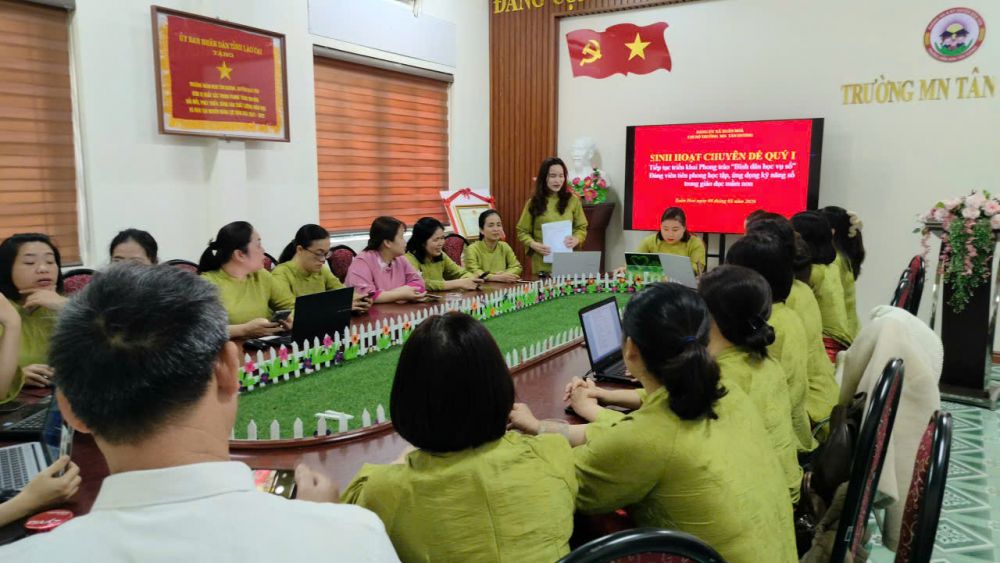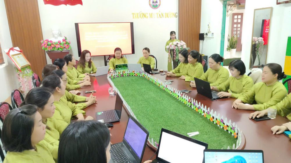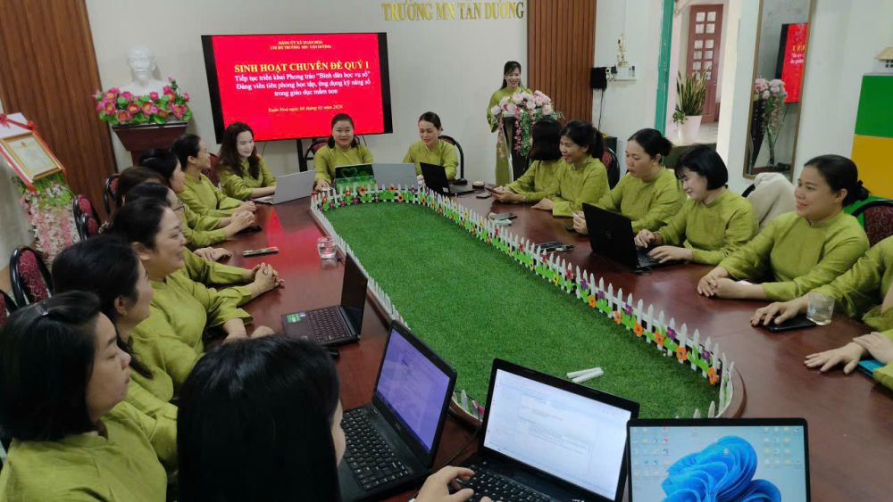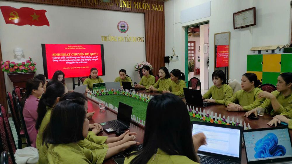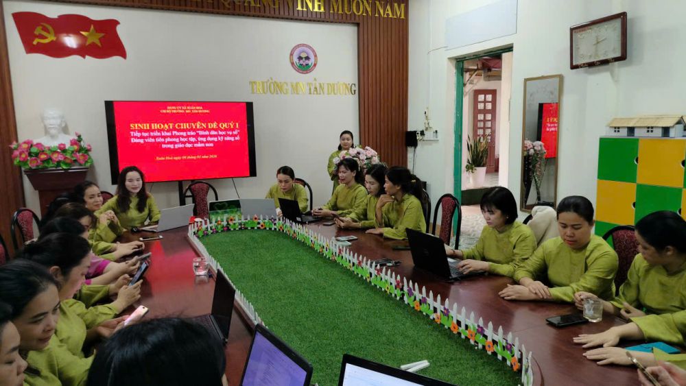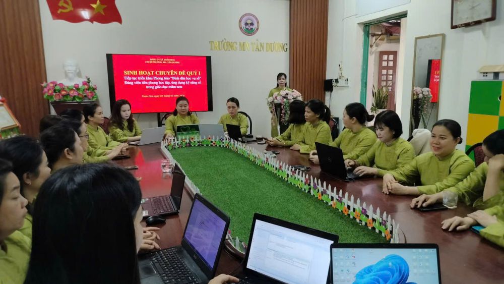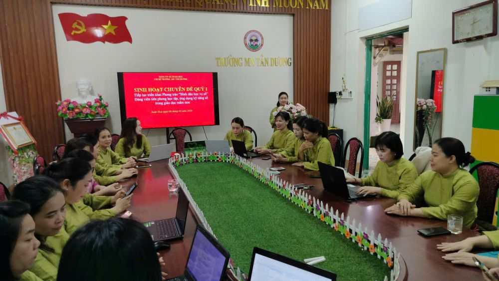Thực hiện kế hoạch sinh hoạt chuyên đề quý I, Chi bộ trường MN Tân Dương đã tổ chức sinh hoạt chuyên đề “Tiếp tục triển khai phong trào Bình dân học vụ số – Đảng viên tiên phong học tập, ứng dụng kỹ năng số trong giáo dục mầm non”.